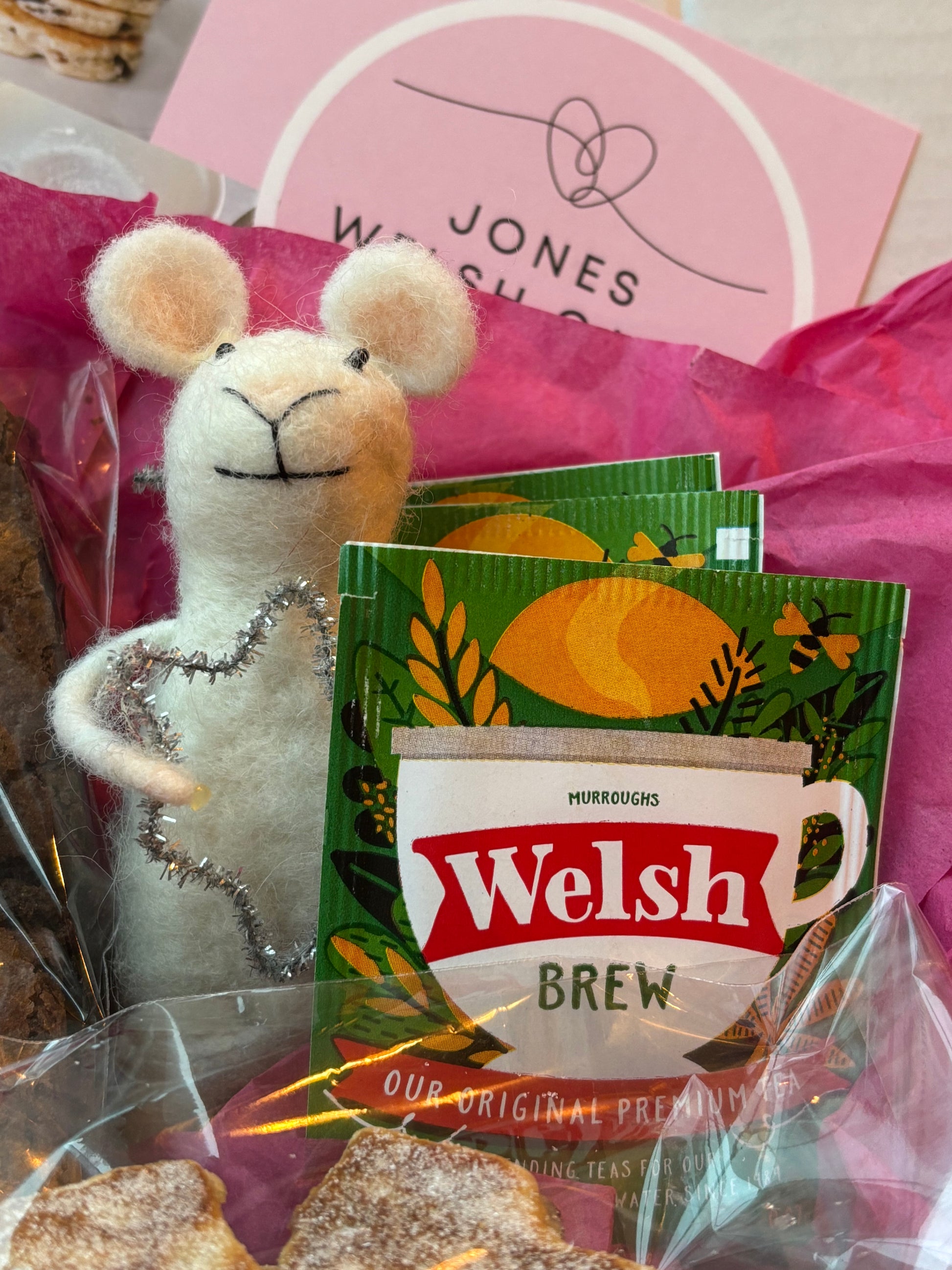 Your box will contain 4 Star shaped Welsh Cakes, 4 Christmas tree shaped Welsh Cakes, 2 Double Chocolate Brownies and 4 Welsh Brew Teabags!